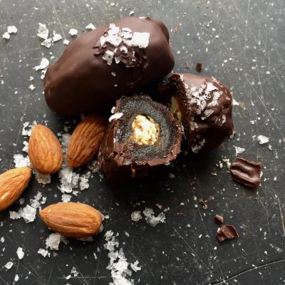 6 x chocolate enrobed Medjool dates stuffed with chopped almond w/ sea salt (V)