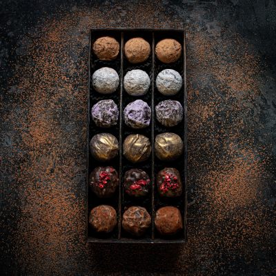 18 mixed truffles – 3 x Amazeballs, 3 x Ferrer O’Reilly, 3 x Nutty Razza, 3 x Almond I Scrumptious? & 3 each of two seasonal varieties (V)
