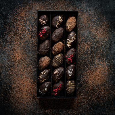 12 x chocolate enrobed Medjool dates – 2 x Almond Salty, 2 x Almond Kiss, 2 x Brazil Boost, 2 x Cashew Rose, 2 x Halva Honey, 2 x Hazel Hug